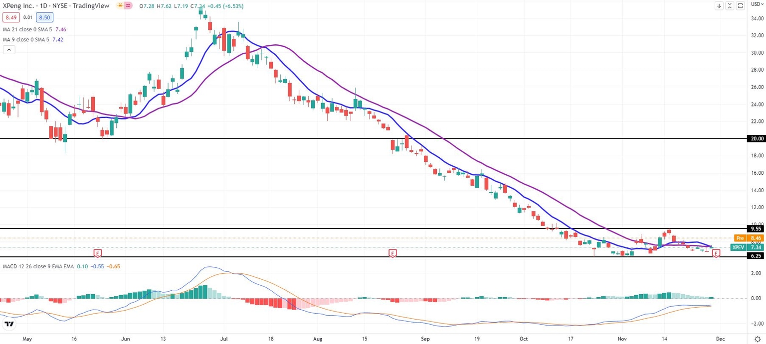 Year to date XPEV stock is down more than 85% prior to the surging rally in Wednesday's premarket. Now Wednesday's spike could send shares up to $9.55, which is where XPeng stock discovered resistance on November 15. XPEV shares momentarily made it up to $9.55 on Wednesday morning but then fell lower. Below here the EV maker found support at $6.25 in late October and the first few session of November. The long-term price target for bulls is at $20, but it is extremely doubtful that Xpeng stock makes it anywhere near there soon.