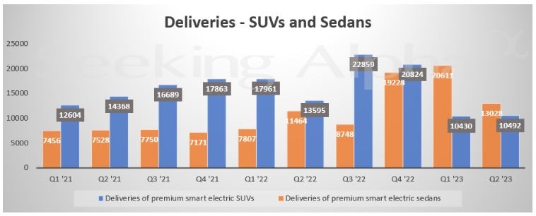 SUV deliveries were reported at 13,595 in Q2 2022 but just 10,492 in the current second quarter. Sedan deliveries rose from 11,464 in the quarter last year to 13,028 this year.
