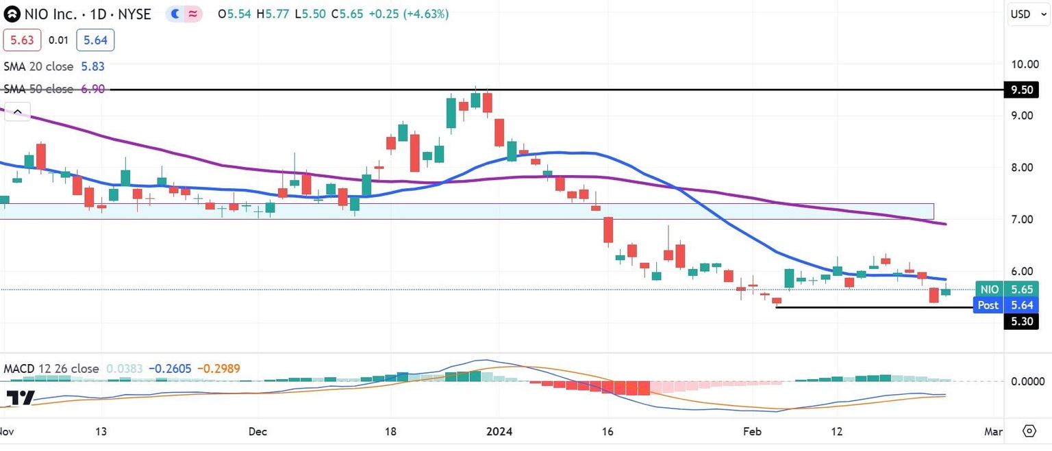 Nio stock closed up 4.6% to $5.65 on Monday. The stock is certainly in a downtrend and will be until the February 16 range high at $6.34 is overcome. For now, the February 5 low at $5.30 is the place of near-term support.