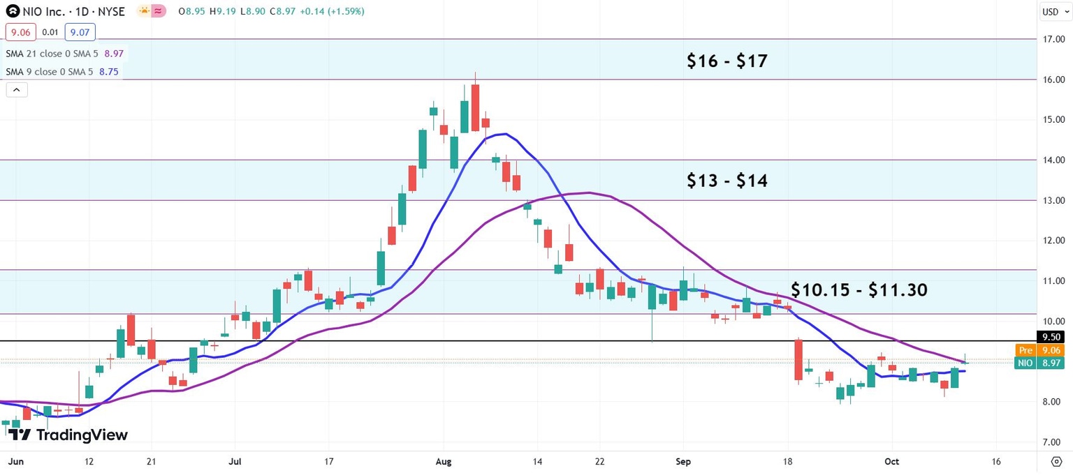Nio (NIO) stock trades 2.5% lower at the beginning of Thursday's regular session. NNIO appears stuck below the $9 price level, close to the 21-day Simple Moving Average (SMA). Initially, NIO shares advanced close to 1% before the market opened, but the September Consumer Price Index (CPI) read on inflation was higher than expected.