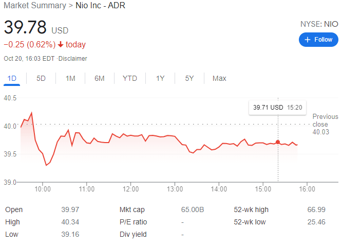 Update: NYSE:NIO was unable to retain early gains and finished the day down 0.62% at $39.78 per share. The slide seems corrective after the share added roughly 12% in the previous sessions. Meanwhile, the Dow Jones Industrial Average and the S&P 500 flirted with record highs, boosted by solid earnings reports. The NYSE added 108 points, up 0.64%, while the Nasdaq Composite was the worst performer, ending the day in the red after shedding 7 points.