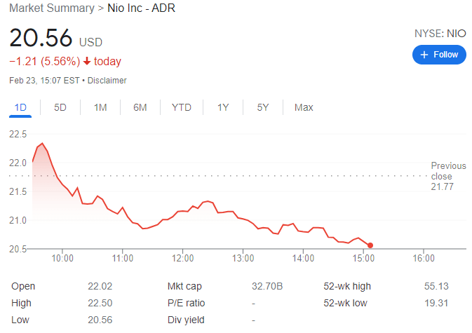 Update: NIO holds a handful of cents above $20 per share heading into Wednesday close, shedding over 5% for a second consecutive day. Wall Street started the day with the three major indexes posting gains, as the day started with optimism. However, the market's sentiment quickly soured amid escalating tensions on the Ukrainian/Russian border. US intelligence suggested that Russia will likely invade Ukraine within the next 48 hours. Also, multiple Ukrainian government websites went offline after a DDoS attack blamed on Russia, while the local government declared the state of emergency. Among US indexes, the Nasdaq Composite is the worst performer, down 2.23%, while the DJIA shed 1.27% or 428 points.