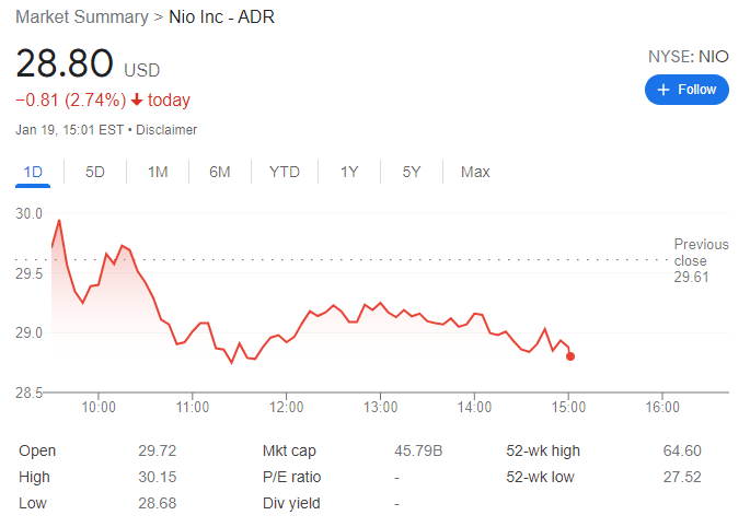 Update: NYSE:NIO is set to close Wednesday with losses, now trading at $28.80 per share, down 2.74% in the day, and near a 52-week low of $27.52. Stocks managed to trade in positive territory at the beginning of the session and following the lead of their European counterparts but quickly turned red. The NYSE is down 24 points, while the worst performer is the DJIA, down over 100 points.