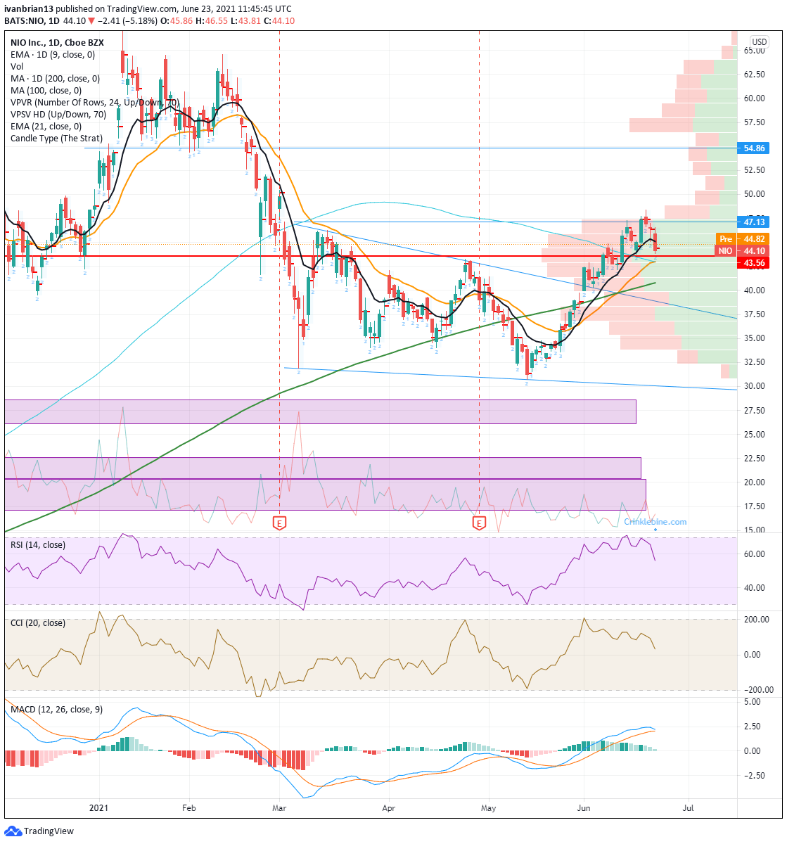 NIO shares got stuck in reverse on Tuesday as the stock dropped $5 to close at $44.10. Not too unexpected though as NIO stock has had a decent rally from the $30 low set in mid-May. The rally caught the eye of Citibank, who saw 50% upside for the stock in their most recent upgrade. NIO was charged up and ready for a drive higher on the back of some strong data in early June. Delivery data was strong, and Citi said "expect NIO's monthly new order volumes in May-Jun[e] to be 20-30% higher than the average monthly level in 4Q20 peak season." LiAuto (LI) chimed in with its own strong numbers as deliveries of the company's Li ONE model rose by 101% YoY. Xpeng (XPEV) CEO Brian Gu said, “We are on track to meet or exceed second-quarter delivery numbers, which I think means Chinese EV demand is still very strong.” All in all, there is plenty of positive news flow for the Chinese electric vehicle sector.