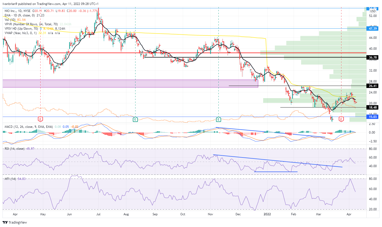The money flow index flashed an overbought signal for NIO stock which now looks like it will play out correctly. Premarket sees $18.48 broken and so puts NIO stock firmly back in a downtrend. NIO stock needed to break above $26.41 to stay bullish but it has failed to do so. That means the downtrend targets $15.03 and then a new low below $13.01. MACD also about to flash a sell signal.