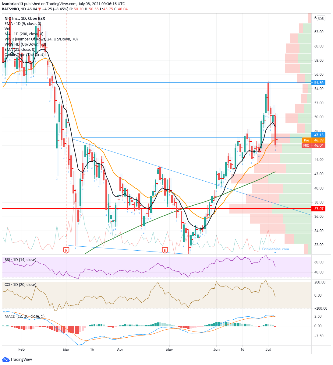 NIO shares ran into a wall of selling yesterday as the meme stock massacre caught fire with nearly all our favourite retail names suffering serious losses. NIO was badly hit with a loss of nearly 9%. The shares suffered from a general sell-off in the meme stock universe and also as the Chinese stock NIO got extra negative read-across from the DIDI situation (see more) also hit home. We had cautioned against fresh longs on Wednesday in our article "Three reasons why a pullback to $42 in NIO is likely" as the stock had been overbought last week on the Relative Strength Index (RSI) and had slammed into resistance at $54.86.