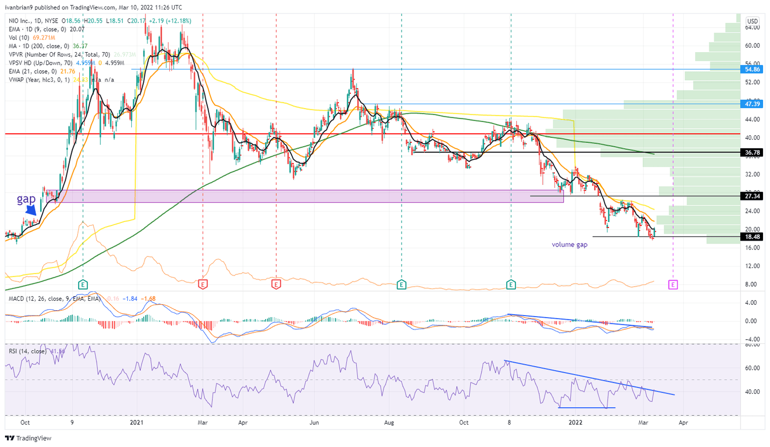 The move yesterday was impressive but highlights the extent of NIO's decline. The move did not even get back up to the 9-day moving average. NIO is still bearish on the chart with a declining Relative Strength Index (RSI) and Moving Average Convergence Divergernce (MACD). Nio is trading below all major moving averages, both short and long term.