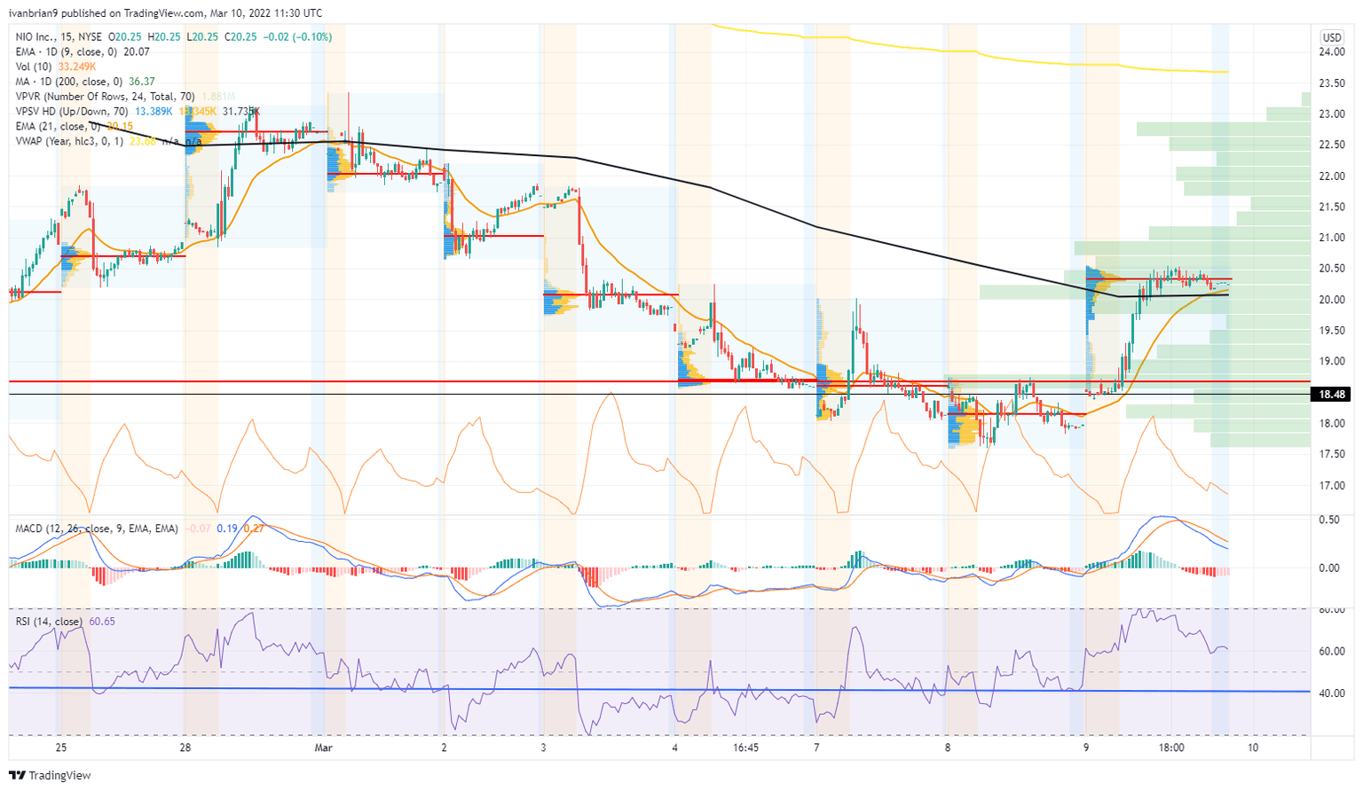 From the NIO 15-minute chart below, we can see most of the volume on Wednesday took place at the higher end of the range, which is positive in the short term. NIO, therefore, needs to hold the lower end of this volume at $19.75 to push ahead further on Thursday. Below and a move back to $19 is highly likely. Again $18.48 is key with a huge volume profile down there giving strong support. A break is strongly bearish.