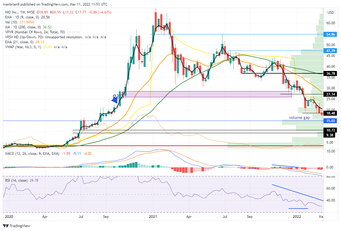 The bearish trend continues now that Nio has broken the support at $18.48. This brings into focus the big old high from July 2020 around $15. There is a volume gap from $18 to $15, which could mean a sharp drop, but $15 does have decent volume so should stabilise the fall. There is an important gap from $10.72 to $9.38. $27.34 remain the bearish pivot, above NIO is back to being bullish.
