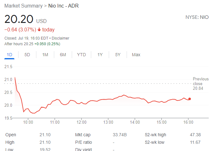 NYSE:NIO dipped lower to close the week as renewed crackdowns on Chinese tech companies sent ADR stocks tumbling into the weekend. On Friday, shares of Nio fell by 1.57% and closed the trading week at $20.72. Stocks soared higher on Friday as investors shrugged off the record CPI report from June and a mixed start to Wall Street earnings season. Overall, the Dow Jones jumped higher by 658 basis points, the S&P 500 rose by 1.92%, and the NASDAQ posted a 1.79% during the session.