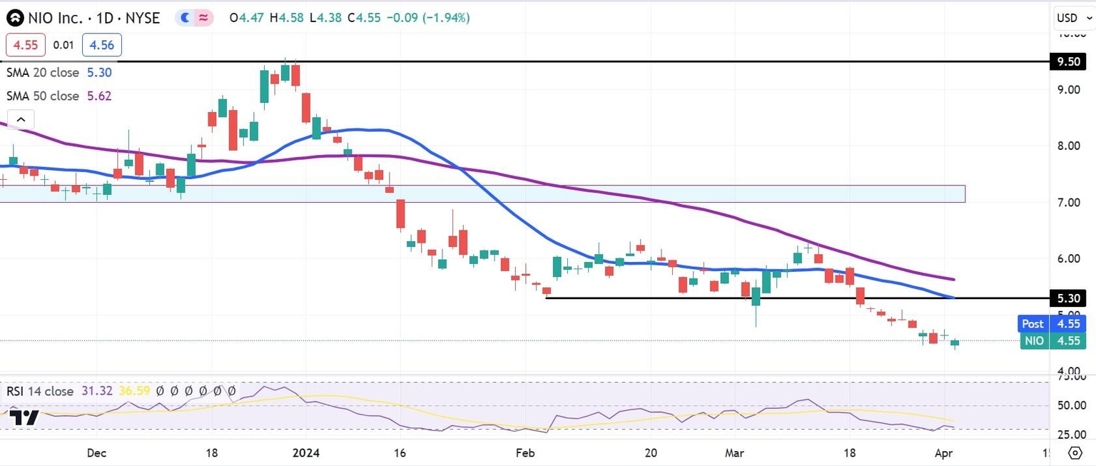 - NIO stock has sunk to a near four-year low near $4.50.