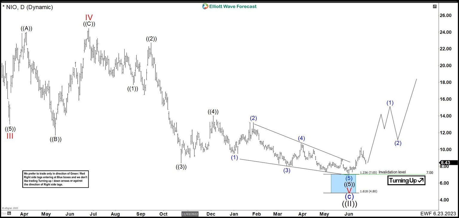 In the chart above, we can see how NIO made a nice rally from the blue box with more than 125% in profits. However, the pullback has been too deep. It still has not broken the low of 7.00, but with the market conditions it is more likely that is going to happen. That is why we adjusted the count and we called wave (c) in blue as an ending diagonal. Wave I of (c) ended at 11.67 low and wave II bounce finished at 24.43. We can see 5 waves down making the wave ((5)) of III an ending diagonal structure completing at 7.33 low. Then, took a part a 3-3-5 flat correction as wave IV ending at 16.18 high.