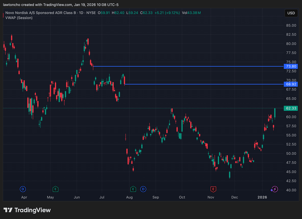 From a technical standpoint, there are two primary resistance regions I am paying close attention to. The first is the $69 area, which represents a gap fill from July 29 of last year. Gap fill zones often act as natural areas of friction, and this level stands out clearly on the chart. If NVO approaches this region, I will be watching closely to see whether price stalls or reacts.