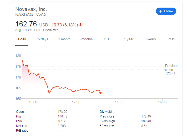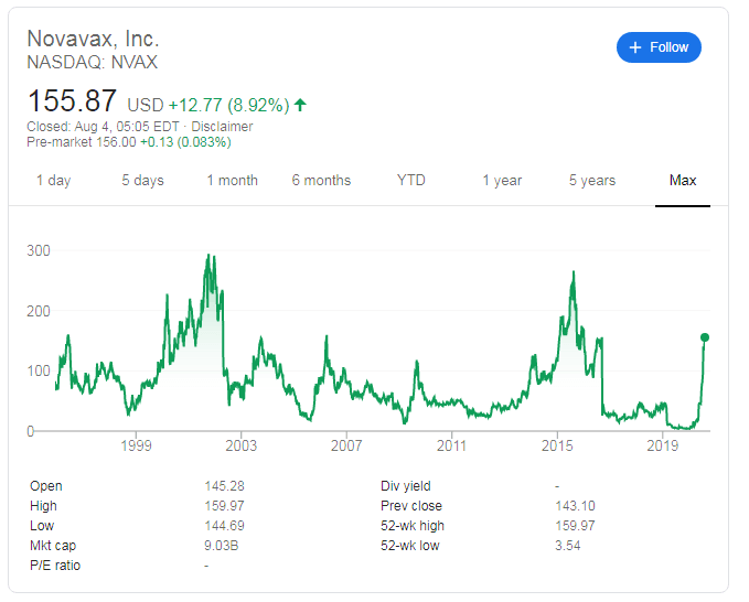 Update 6: Novavax shares are rising toward $170 in Friday's trading, defying the mixed market mood. Investors are concerned with Sino-American tensions while they are pleased with the relatively upbeat Non-Farm Payrolls report. See Reports US to sanction Hong Kong leader Carrie Lam