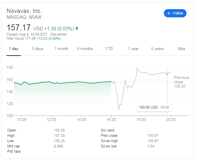 NASDAQ: NVAX has surged above $171 in after-hours trading, an increase of nearly 9% ahead of Wednesday's regular trading session.
