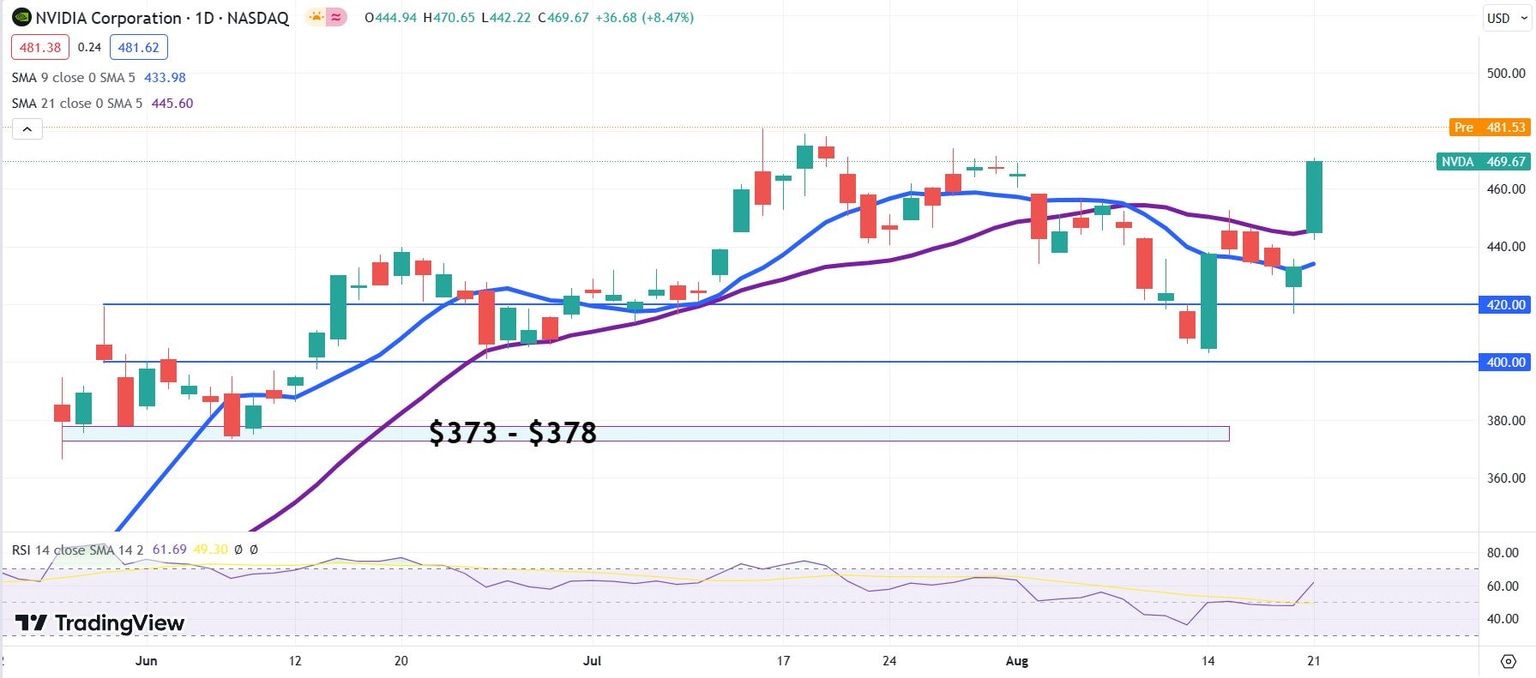Support sits at $420, $400 and the $373 to $378 demand zone from June. The Relative Strength Index (RSI) reading near 60 demonstrates that NVDA is far from overbought, even at this elevated price level. A major beat late Wednesday could easily lead NVDA into the $500s.