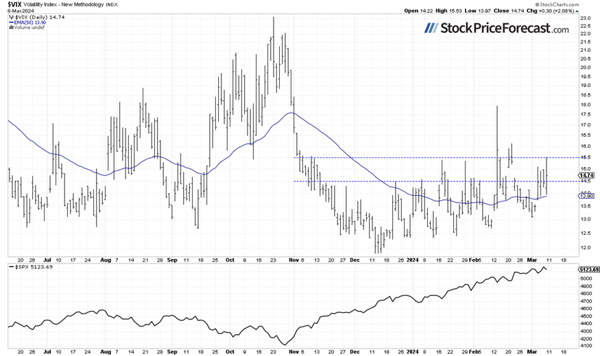 The VIX index, also known as the fear gauge, is derived from option prices. In the middle of last week, it remained elevated despite new records for the indexes, and on Friday, it reached as high as 15.50 as stock prices were retracing their advances.