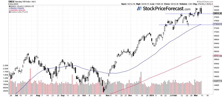 The technology-focused Nasdaq 100 index reached a new record high of 18,416.73 on Friday, but it closed 1.54% lower, retracing the recent advances and getting closer to the 18,000 level again. It remains relatively weaker than the broad stock market, and for now, it looks like a consolidation following a multi-month rally.