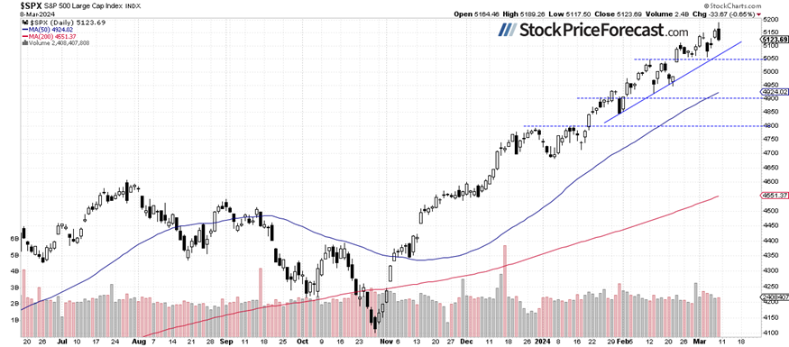 A week ago, in my Stock Price Forecast for March, I noted “So far, stock prices have been trending upwards in the medium to long term, reaching new record highs. The prudent advice one could give right now is to remain bullish or stay on the sidelines if one believes stocks are becoming overvalued and may need a correction. It's likely that the S&P 500 will continue its bull run this month. However, we may encounter a correction or increased volatility at some point as investors start to take profits off the table.”