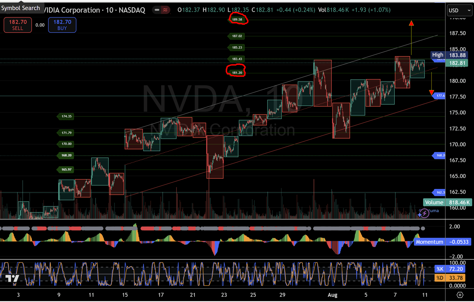 As of Friday, August 8, 2025, NVDA closed at $182.81, stalling just below micro 2 at $183.43, after securing $177.61 pivot and micro 1 at $181.20 earlier in the week.