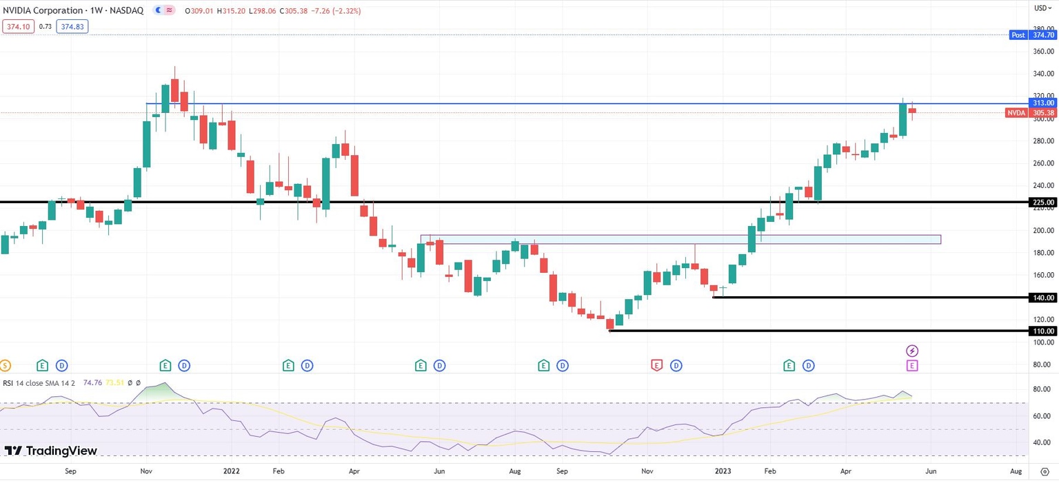 Nvidia has reached a new all-time high. Shares rose about 23% after hours to $375, far higher than the previous all-time high of $246.47 in November 2021. The Relative Strength Index (RSI) is now strongly overbought, and the stock needs to simmer down. However, this excitement is palpable. These earnings alone will likely spur a broad market reversal higher on Thursday.