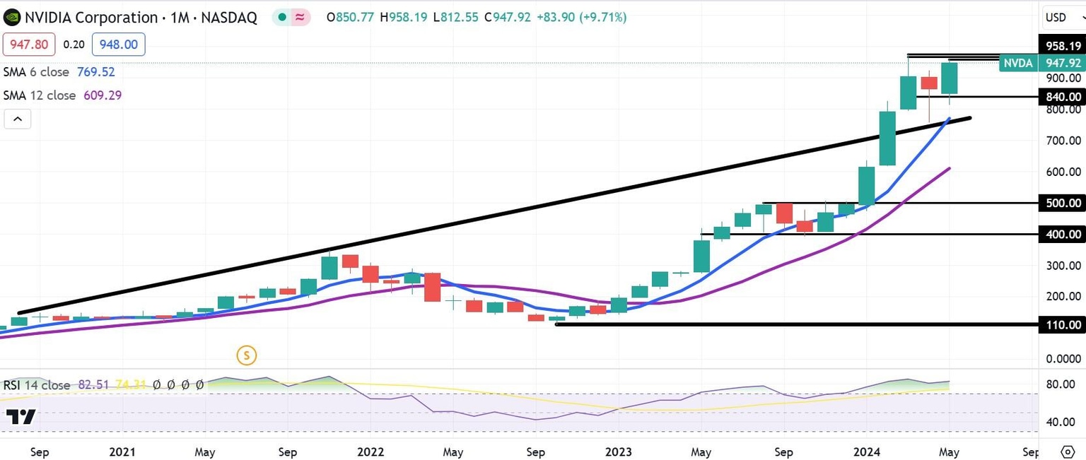 NVDA shares are sitting just below three separate recent range highs, which have all trended down chronologically — a bad sign for bulls. The most recent is the May 16 high of $958.19. Before that was the March 25 range high of $967.66, preceded by March 8’s all-time high at $974.