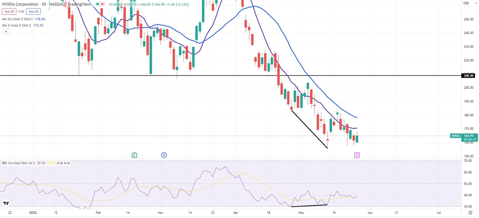 Nvidia (NVDA) stock is trading up 2.1% at $165 on Wednesday ahead of its quarterly earnings call after the close. The semiconductor behemoth known for its GPUs has beaten earnings expectations for 13 consecutive quarters. Ready to make it 14, the market seems uncertain how much if at all inflation and recent retail jitters could affect Nvidia's results.