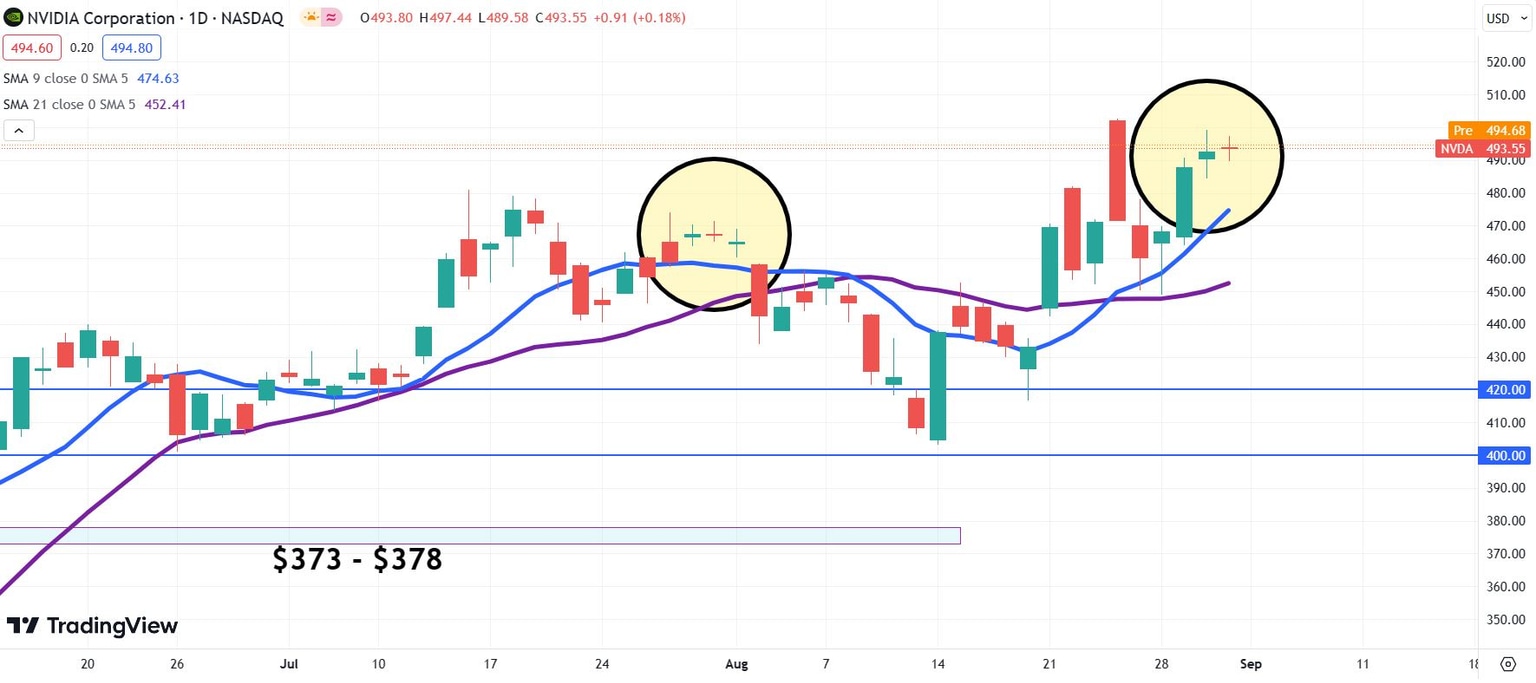 In a similar way to what happened one month ago, Nvidia is a gain seeming to crest higher at quite small intervals. Take a look at the two circles on the daily chart below. These types of candlesticks are typically called Dojis, and they are normally thought to show equivocation.