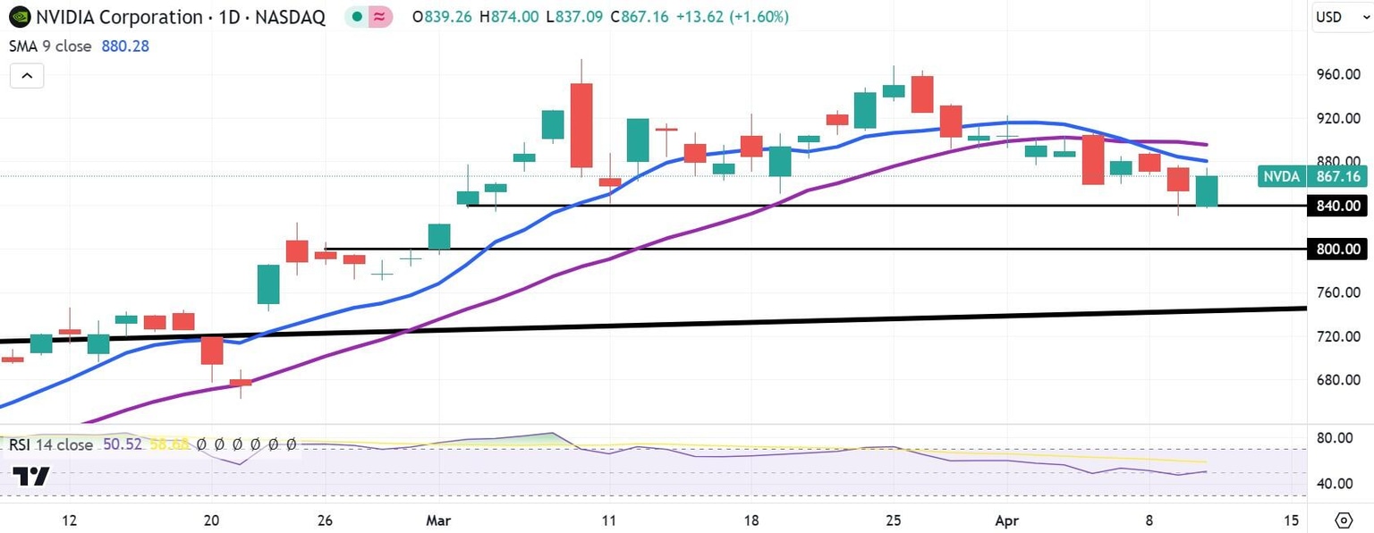 On Wednesday morning, Nvidia dipped momentarily below the $840 support, which stems from early March, but quickly picked itself back up. It spent the remainder of the session in the $860s. This would appear to tell us that the $840 support is still in play, although $800 sits nearby and flipped from resistance into support earlier this year as well.