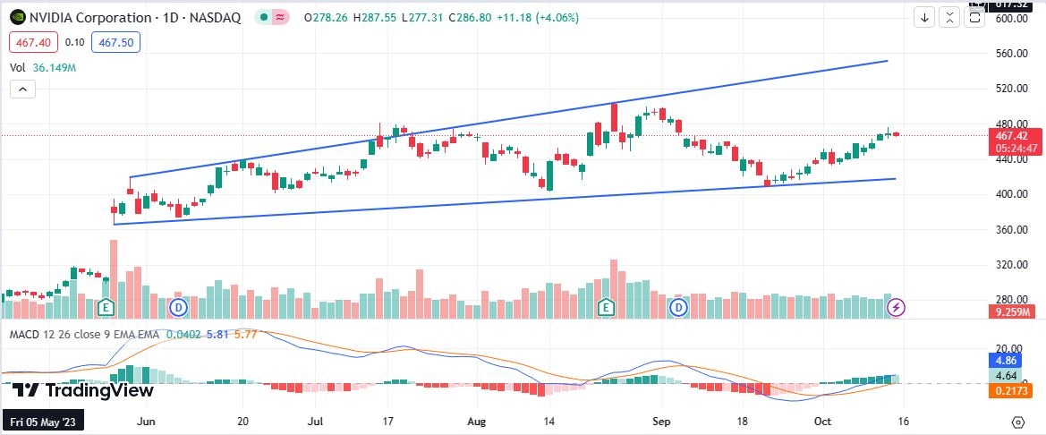 The Moving Average Convergence Divergence (MACD) indicator has been in a bullish crossover for a while now. The $470 range that acted as resistance on NVDA’s way down in late July could emerge as resistance once again. But the main trend here is a widening upward trend channel.