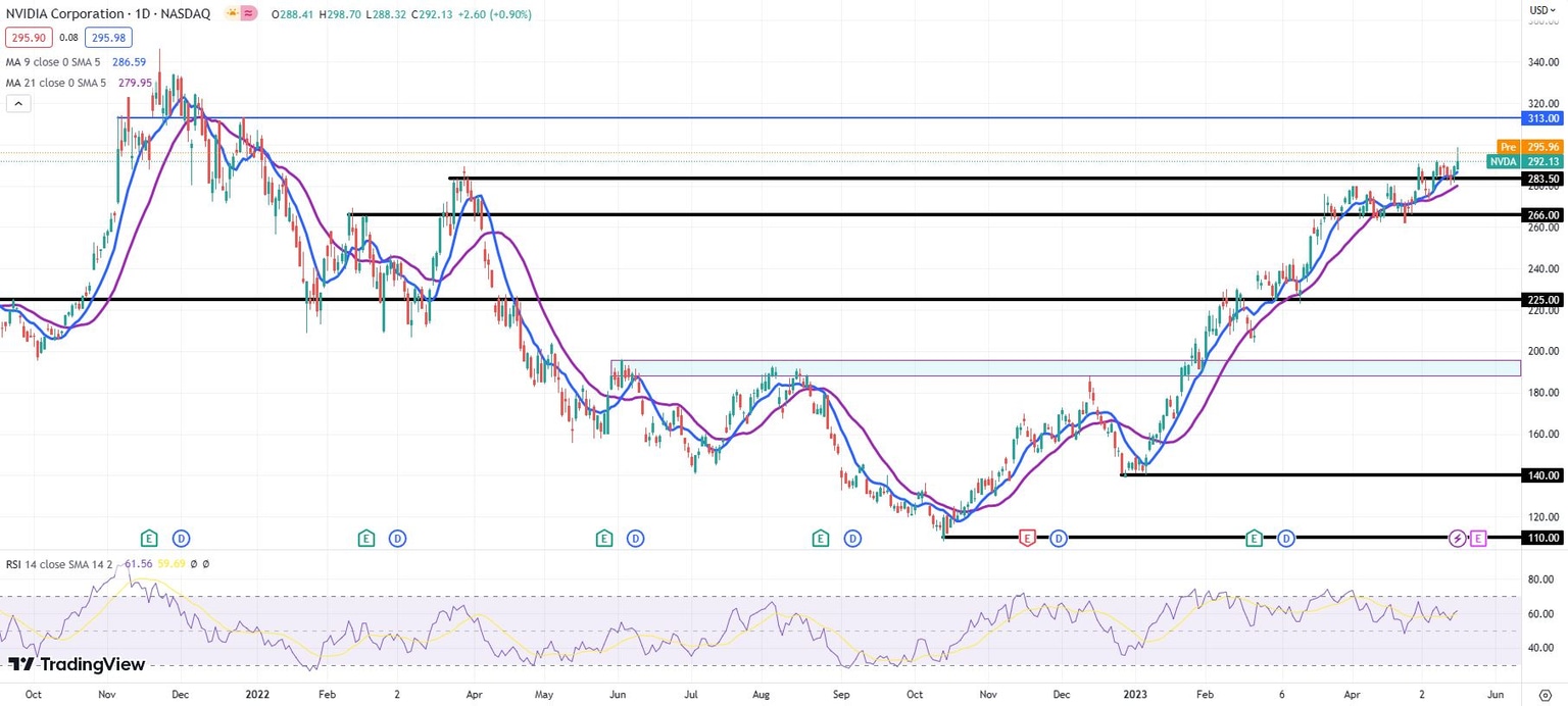 Just since this March, two months ago, Nvidia stock easily broke through resistance stemming from February 2022 at $266 and the $283.50 resistance point from March 2022. Now bulls must have their sights set on shoulder formation at $313 from late 2021. This is the only historical point of resistance from Nvidia’s all-time high at $346.47.