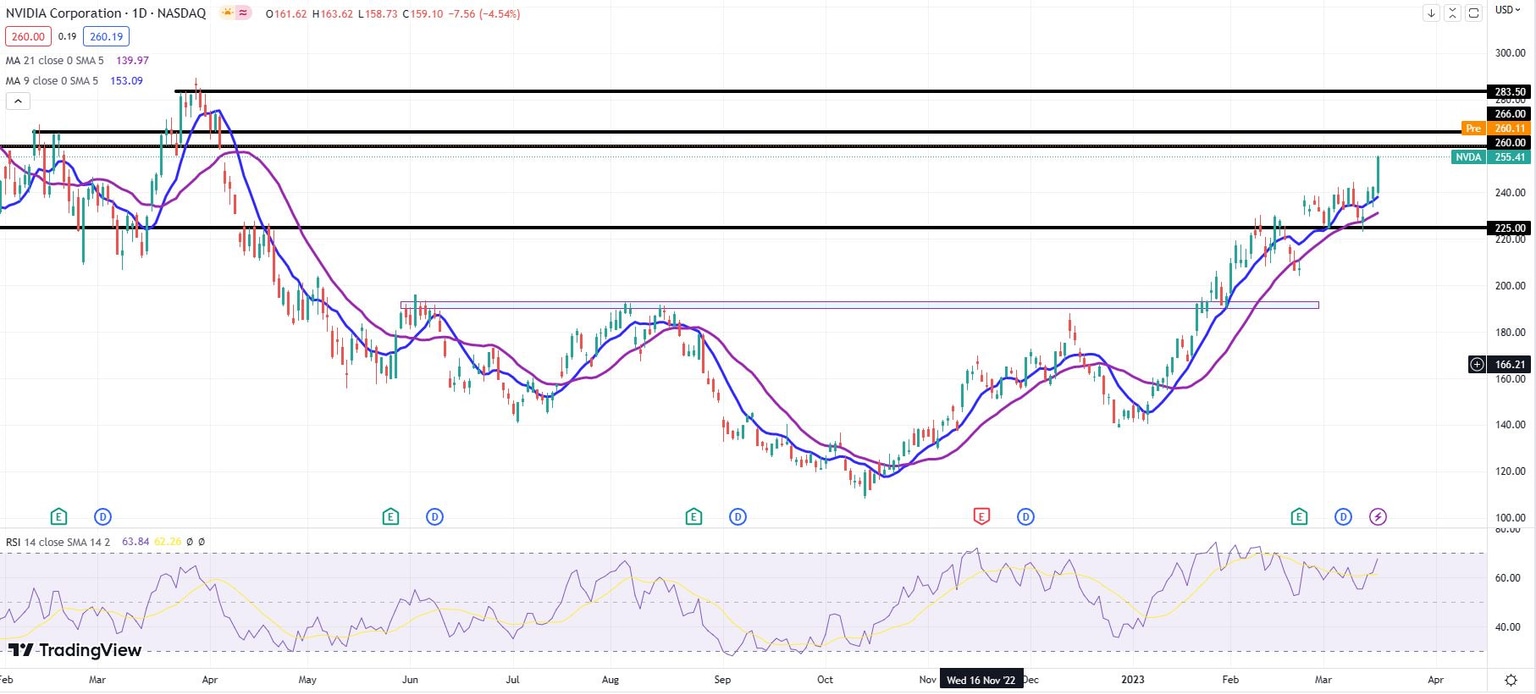 Nvidia (NVDA) stock moved ahead in contrast to the market sell-off on Friday morning. NVDA shares rose 1.8% to $260, its highest price in nearly a year, after Morgan Stanley upgraded shares of the chip designer due to overwhelming optimism regarding demand for its chips in light of the artificial intelligence (AI) "megatrend".