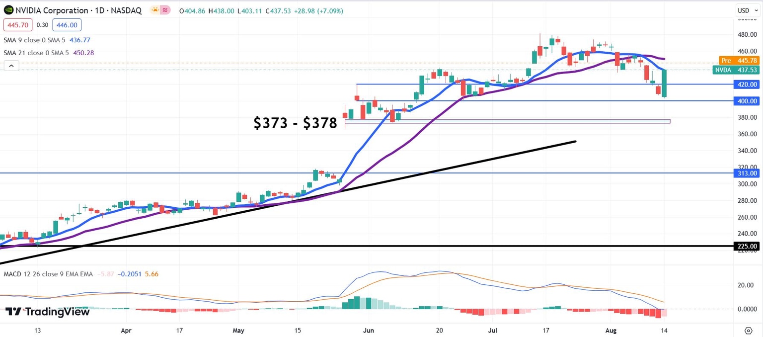 The overall market has been trending lower in August, but expect NVDA price to rise as the August 23 earnings date nears. Traders will want to be positioned well in case another gap up occurs like it did at the Q1 earnings call three months ago.