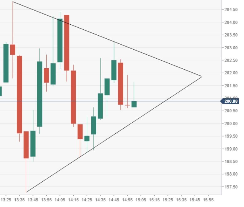 Other growth stocks are also selling off as the Nasdaq Composite sheds 0.8% at about 10:45 AM in New York. At the time of writing, bulls are manning the barricades quite well. NVDA stock is up 0.5% at $202.76. On the 5-minute chart below, it is easy to see that a symmetrical wedge has formed for Friday's session. The apex sits at $201.88, which bodes well for the bulls, at least for now. Dropping below the lower line should lead to a steeper fall off before the close. Likewise, climbing above the top line should engender a positive move as well.