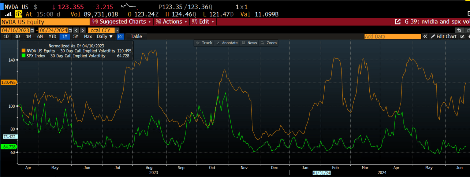 Volatility: as you can see in the chart below, Nvidia is an extremely volatile stock. The chart below shows Nvidia 1-month call option volatility and the Vix (green line). The calm Vix index hides the fact that the second-best performer on the index is extremely volatile. As we have said before, Nvidia does experience periods of extreme volatility, both to the upside and to the downside. If you own this stock, you need to make peace with that. The numbers for the latest sell-off in Nvidia is astounding it has lost nearly $300bn in value and its market capitalization briefly fell below $3trillion. Currently its market cap is below Microsoft’s and Apple’s. This is a long term factor to consider when trading Nvidia.