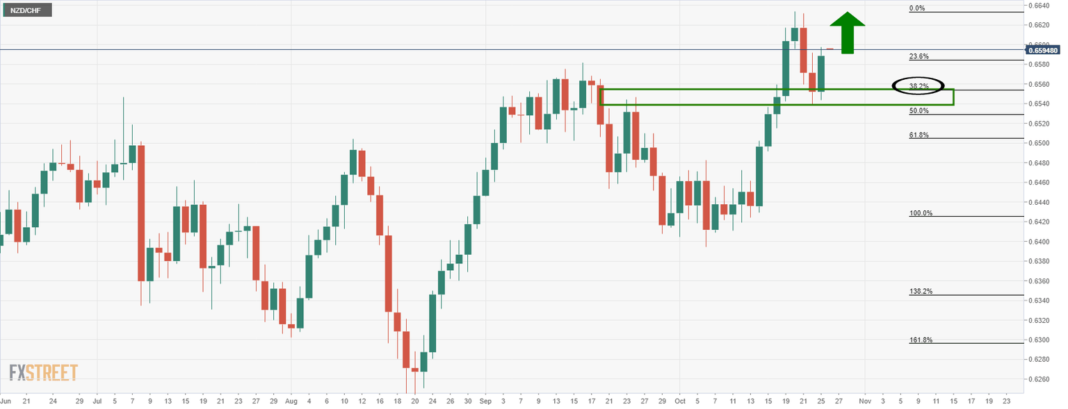 The following is a top-down analysis of the technical outlook from a daily point of view. The bulls are seeking an upside extension at this juncture following a pullback into the horizontal daily support that is competed of the 38.2 Fibonacci retracement level and prior daily highs.