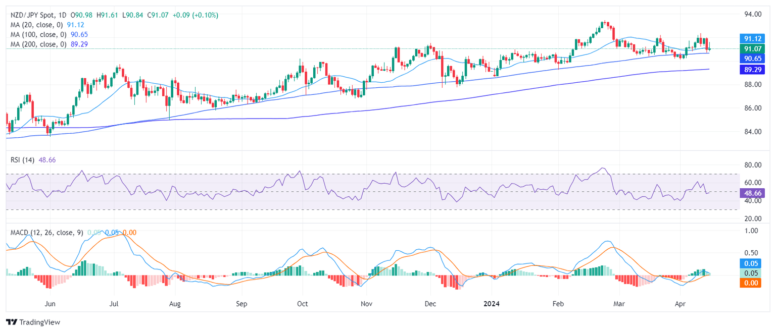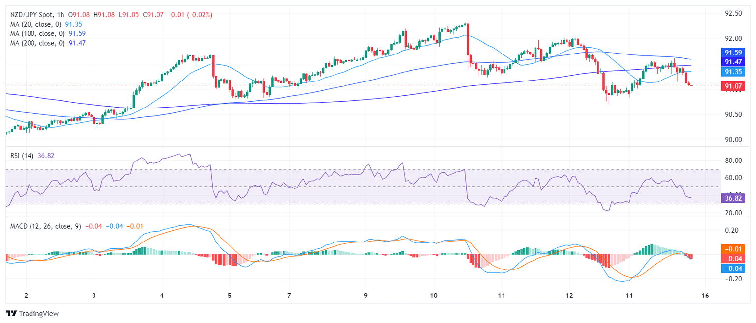 The NZD/JPY is trading at the 91.14 level, securing some daily gains after peaking at a daily high of 91.60. Despite a bearish short-term trend, the pair maintains a bullish position over the longer term, being positioned above key Simple Moving Averages (SMAs). For the short term, bears seem to be gearing up and bulls starting to weaken.