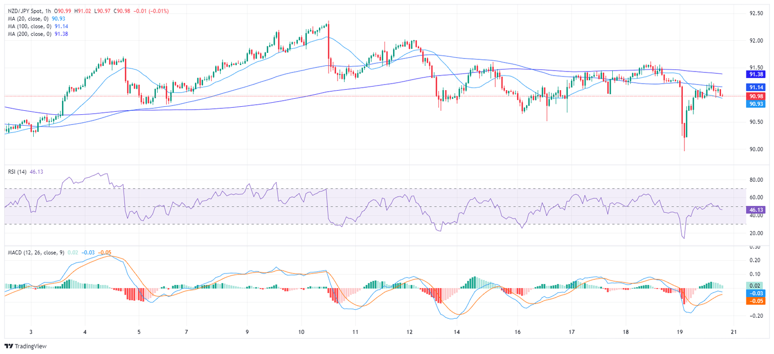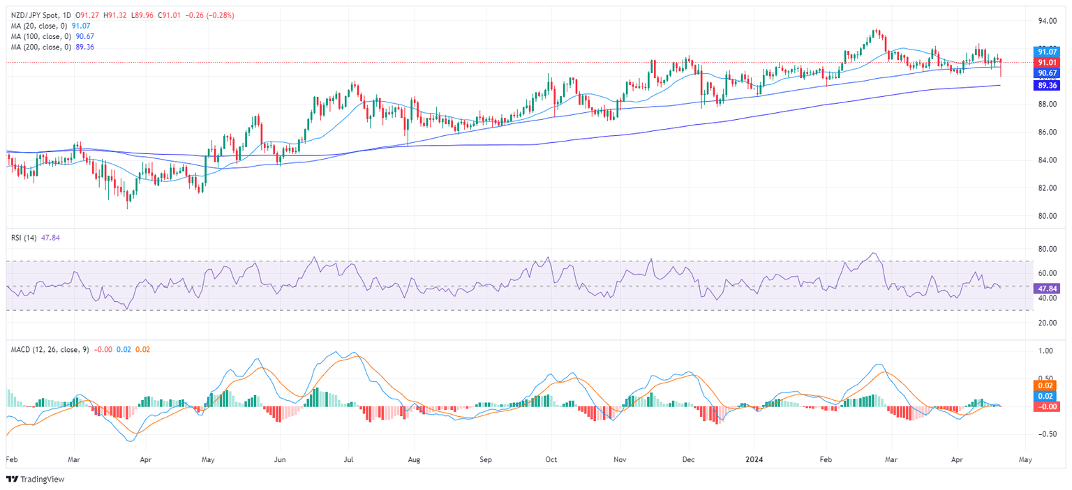 - The daily chart of the NZD/JPY indicates a weakening momentum, with RSI and MACD signifying rising selling pressure.