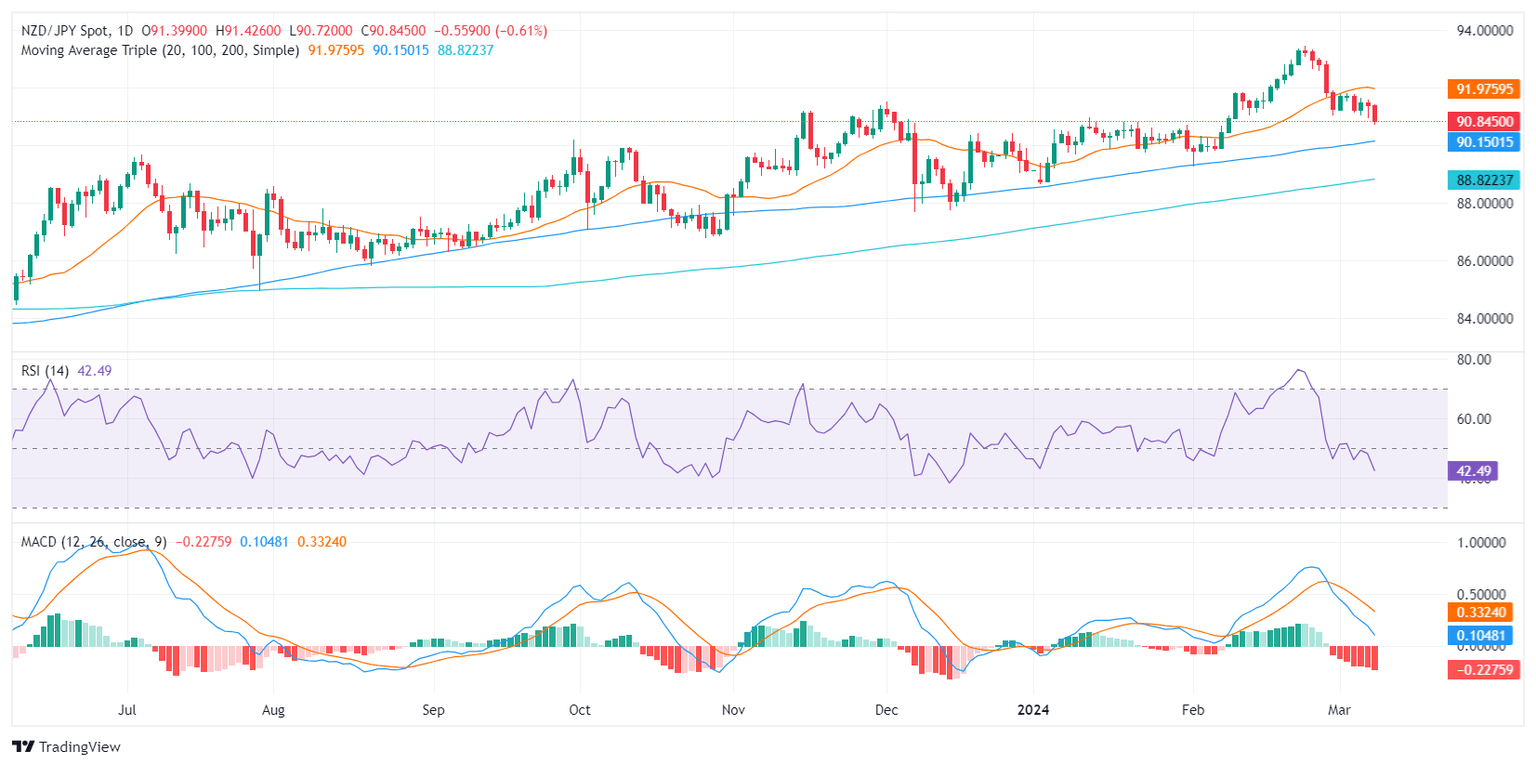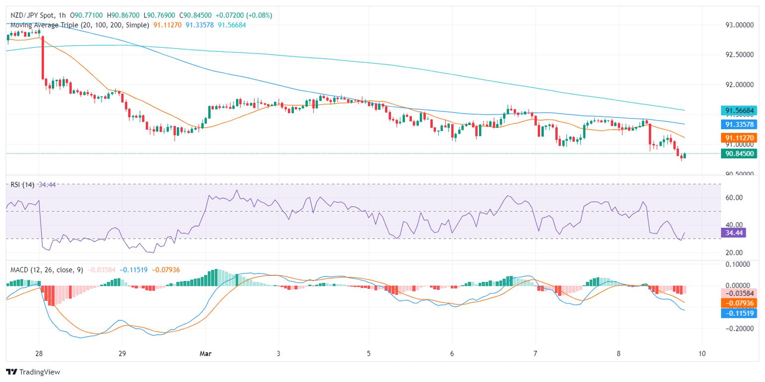 In Friday's session, the NZD/JPY pair is currently changing hands at 90.84, down 0.50%. The technical outlook for the pair points to strong control from sellers. Even though the market has been under a selling spree, recent conditions hint at a potential weakening of this selling pressure.