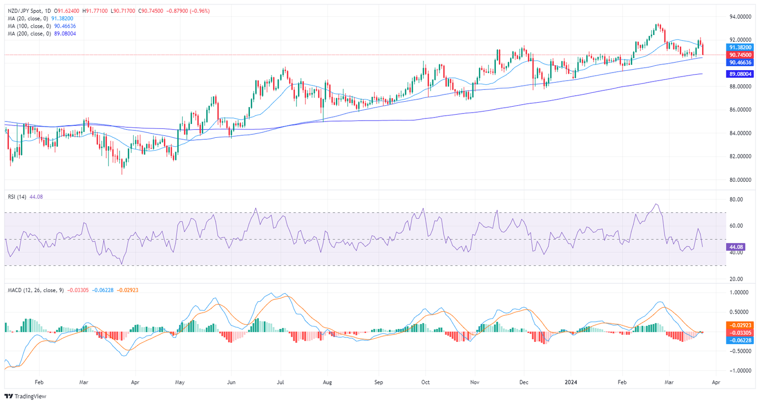 The NZD/JPY pair is trading at 90.748, marking a significant dip of 0.98%. Despite the presence of strong selling pressure, the pair persistently resides above its 100 and 200-day Simple Moving Averages (SMAs). This suggests a dominant bullish force in long-term time frames. But the fact the sellers conquered the 20-day average, paints the short-term outlook with a negative tone.