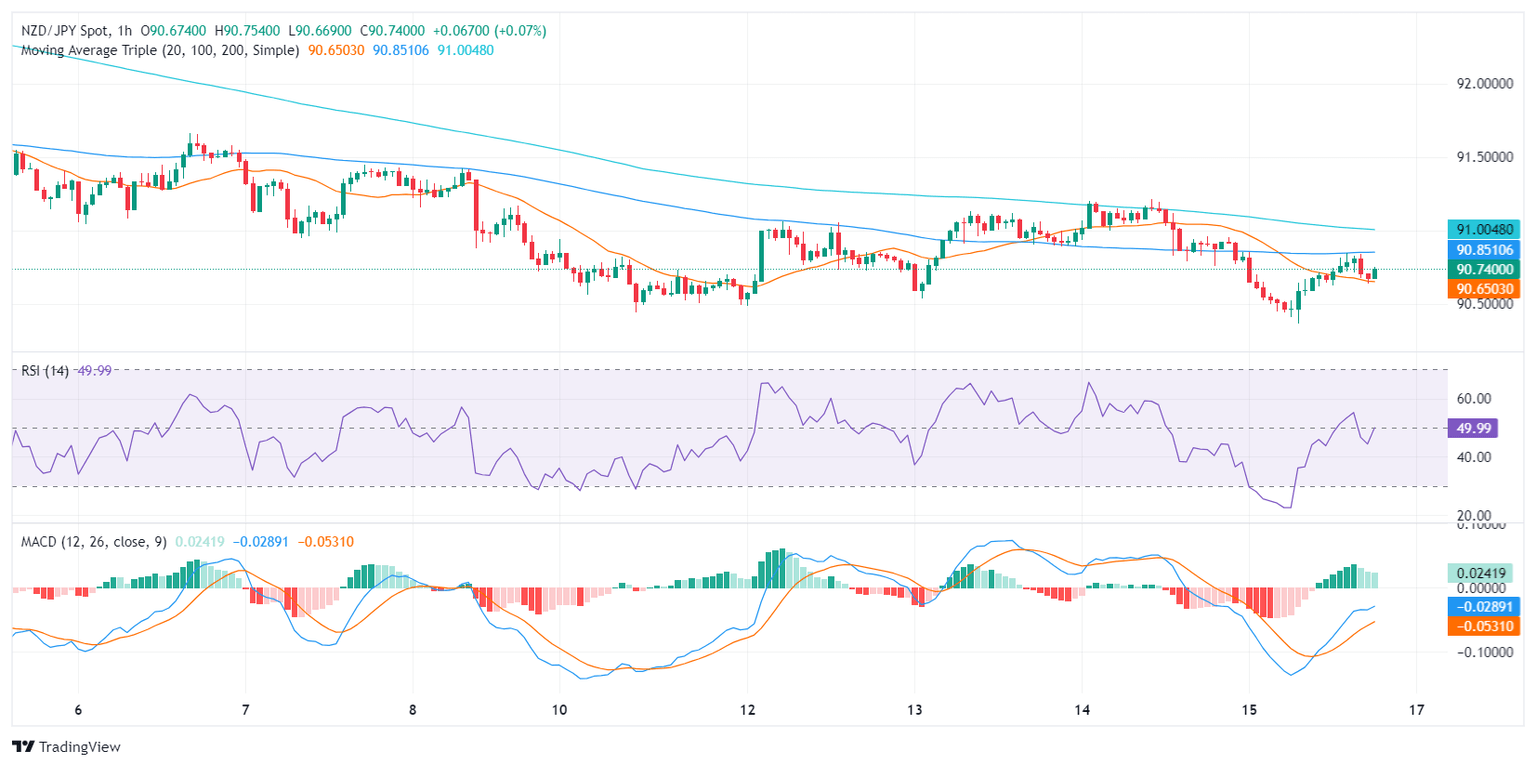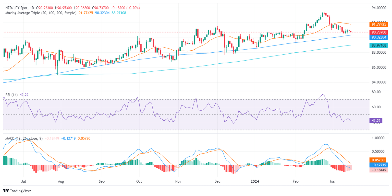 In Friday's session, the NZD/JPY is trading at 90.70, recording a slight loss of 0.22% after bottoming at a low of 90.35. The positioning of the pair above the key 100 and 200-day Simple Moving Averages (SMAs) might hint at bullish prospects in the overall trend, yet the shorter technical outlook tilts toward the bears as it trades below the 20-day average.