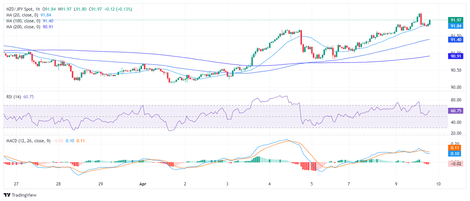 The NZD/JPY pair is trading at 91.79, experiencing a 0.25% uptick. It is currently showcasing a strong bullish course, with reinforced buying momentum as it comfortably positions above its main Simple Moving Average (SMA). Indicators remain strong on the daily chart while hourly indicators may be hinting at an incoming consolidation.