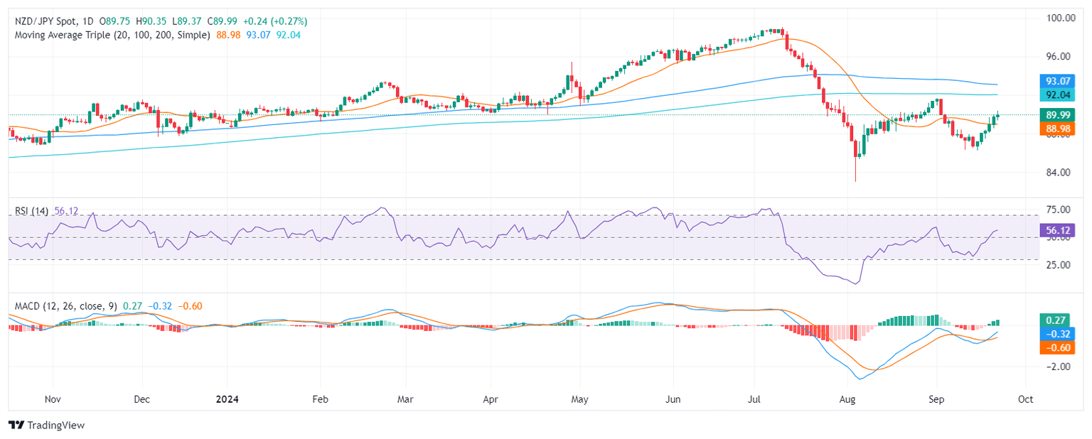 The NZD/JPY pair, after logging a 0.30% gain on Monday, retreated slightly and consolidated around the 90.00 level. The bulls remain in control in the near term, with the technical indicators painting a bullish picture. The Relative Strength Index (RSI) is currently at 56, indicating that buying pressure remains elevated and corresponds to a rising RSI slope, suggesting that buying pressure is increasing. The Moving Average Convergence Divergence (MACD) is also bullish, with the histogram rising and green.