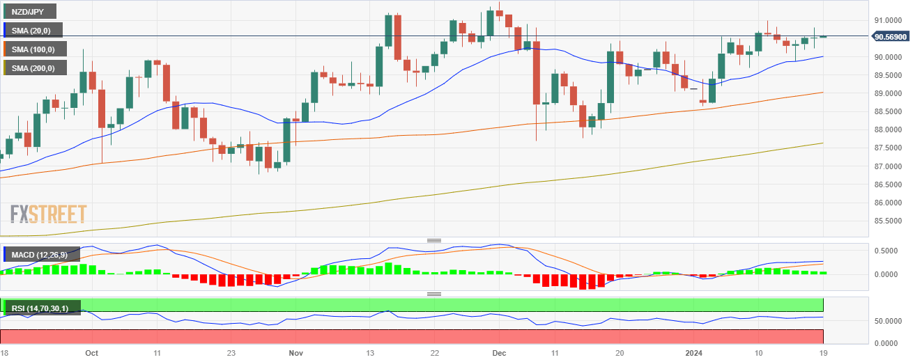 - NZD/JPY stands at 90.62, witnessing mild gains of 0.10% after trading in an 89.90-90-80 range on Thursday.