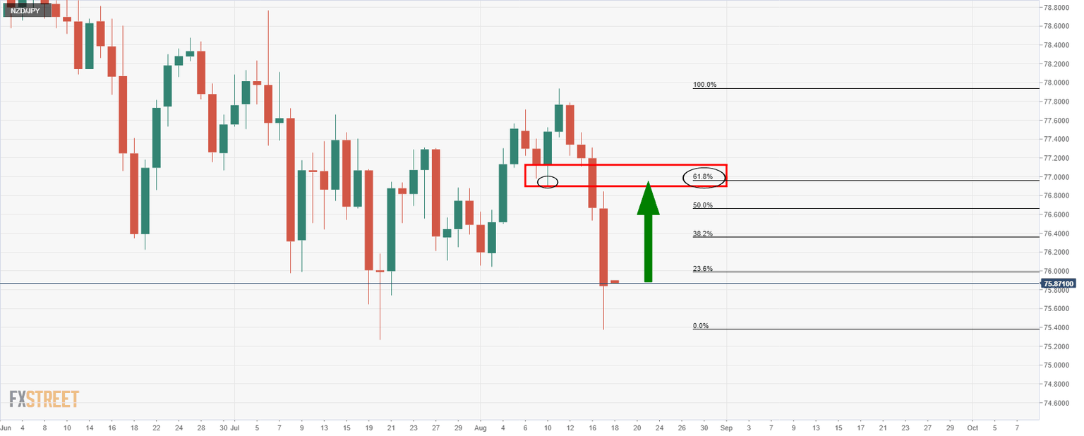 From a daily perspective, the price is establishing and could be headed for a test of the confluence between the prior lows and the 61.8% Fibonacci retracement target near 76.89.