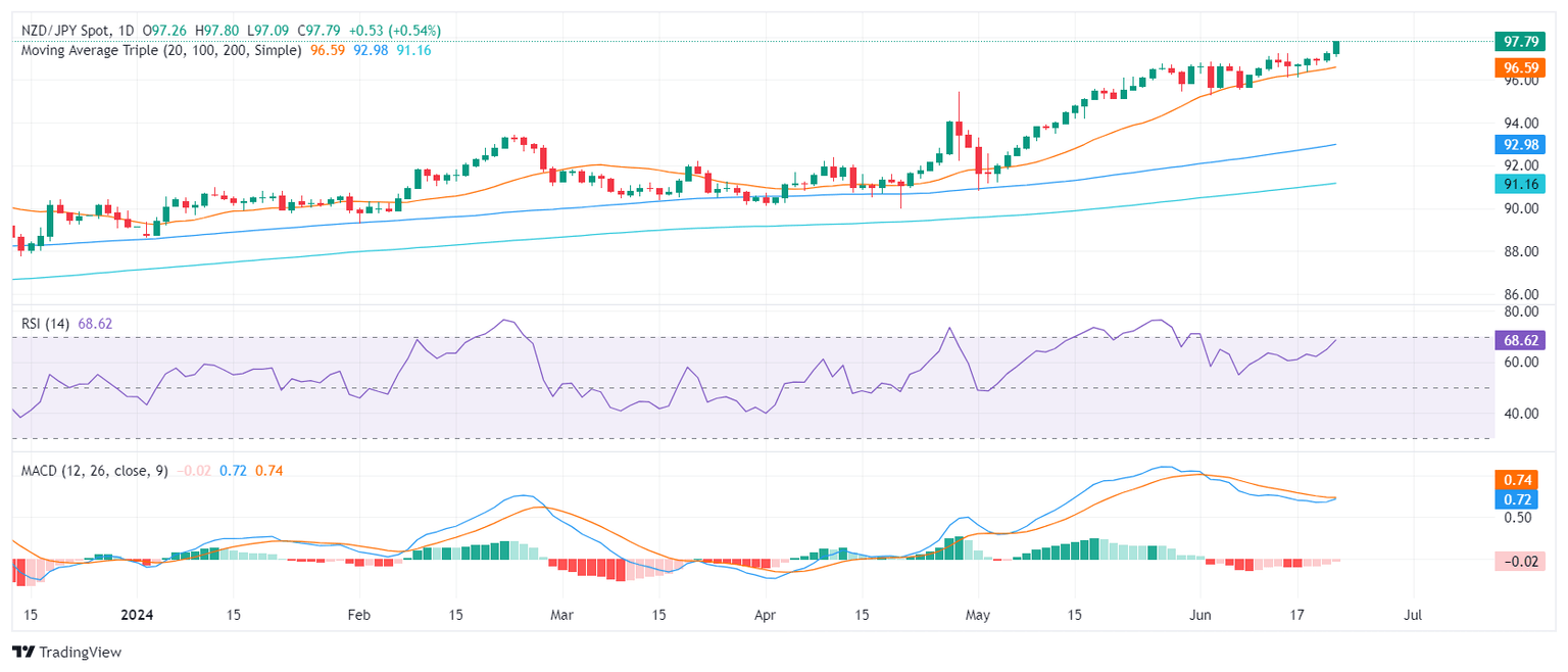 On Friday, the NZD/JPY cross extended advances and established multi-year highs above 97.50. The 20-day Simple Moving Average (SMA), now at 96.60 continued as firm support at the beginning of the week, where buyers ward off sellers' strivings to breach this level.
