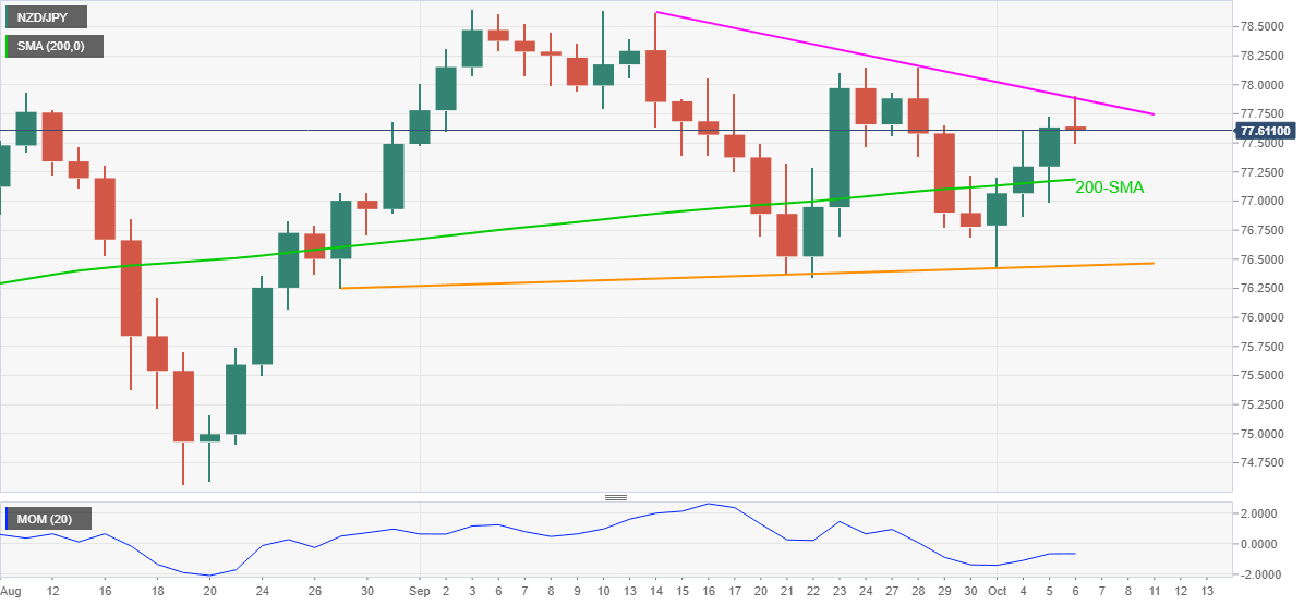 Given the quote’s inability to cross a three-week-old resistance line, coupled with the downbeat Momentum line, NZD/JPY may witness a pullback towards the 200-DMA level of 77.18.