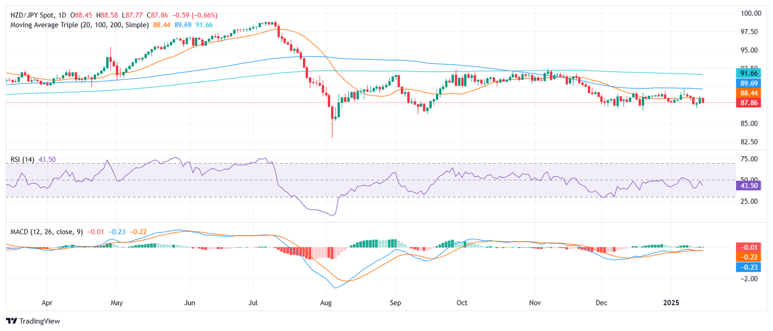 The NZD/JPY cross entered deeper negative territory on Wednesday, giving back 0.77% as it settled around 87.80. Sellers took charge following yet another failed effort to conquer the 20-day Simple Moving Average (SMA) near the 89.00 mark. Although the pair had initially shown signs of stabilization within the broader 89.00–87.00 channel, persistent selling pressure has kept it from mounting a convincing rebound.