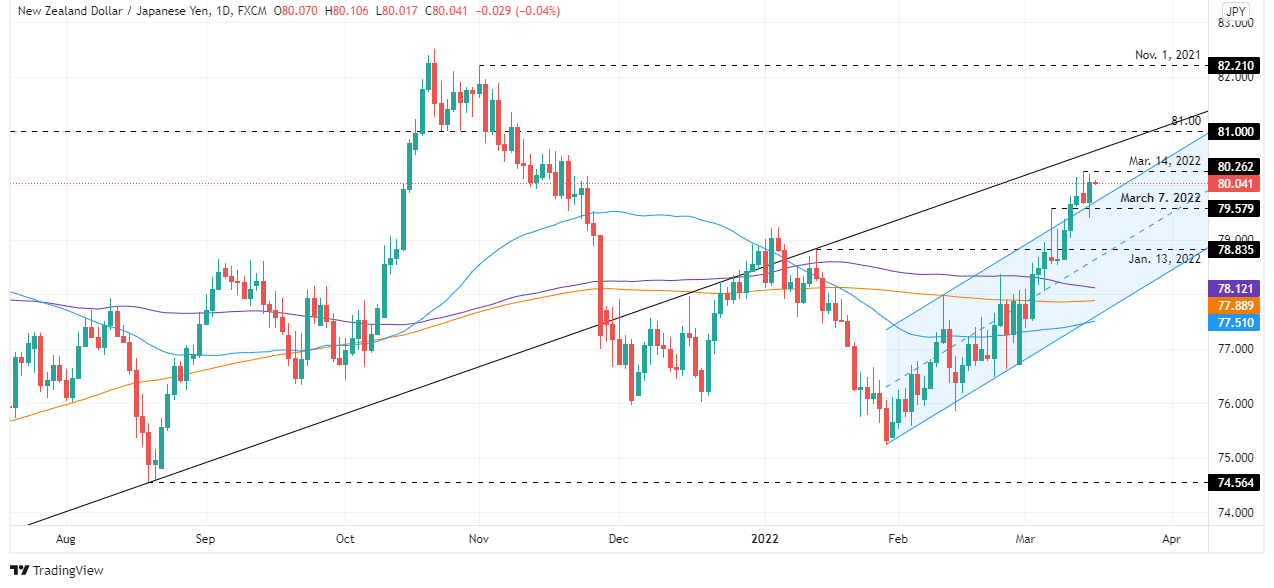 If the NZD/JPY aims to go higher, the first resistance would be March 14, 80.26 high. Breach of the latter would expose the 81.00 mark, followed by a challenge of November 1, 2021, daily high at 82.21.
