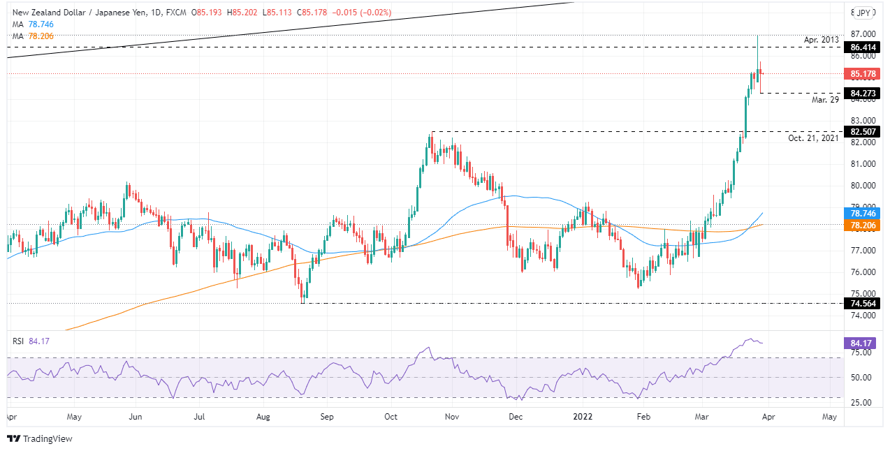 The NZD/JPY grinds lower on Tuesday, although an improved risk appetite as positive news from Eastern Europe suggests that Russia and Ukraine might be finding some agreements in their postures, which could trigger a cease-fire and find a diplomatic solution to the war. At 85.20. the NZD/JPY does not reflect the aforementioned, as the end of the Japanese fiscal year looms, meaning that the yen strengthened on month-end flows.